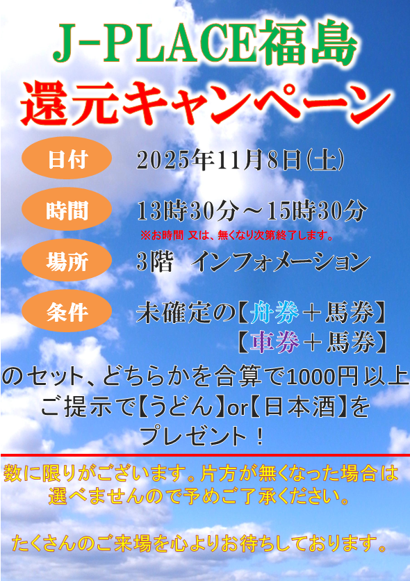 【競輪・ボートレース・J-PLACE】《イベント》2025年11月8日(土)コラボ還元キャンペーンの お知らせ 2025.11.03 ☆サテライト福島・ボートレースチケットショップ福島・J-PLACE福島からのお知らせです。 コラボ還元キャンペーンを開催いたします! 未確定の 舟券+馬券 車券+馬券 のセットどちらかを、合算で1000円以上提示の方に 【うどん】or【日本酒】をプレゼントいたします。 ※数に限りがございます。片方が無くなった場合は選べません。予めご了承ください。 皆様のご来場お待ちしております!
