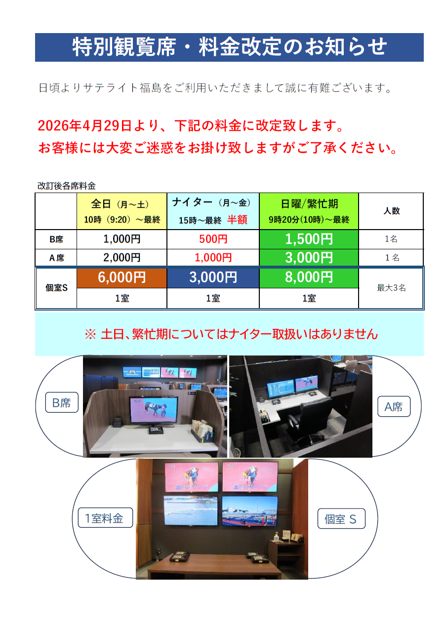 【競輪・ボートレース・競馬・J-PLACE】特別観覧席・4月29日(水・祝)~料金改定のお知らせ 2026.04.22 ☆サテライト福島・ボートレースチケットショップ福島・ニュートラック福島・J-PLACE福島からのお知らせです。 2026年4月29日(水・祝)より特別観覧席のご利用料金を改定いたします。 ※土・日曜日、繁忙期についてはナイターお取扱いはありません。 日曜/繁忙期 9時20分(10時)~ナイター終了まで 競輪・ボートレース・競馬 3競技の映像をひとつの席でご観覧ください。 ご来場お待ちしております。