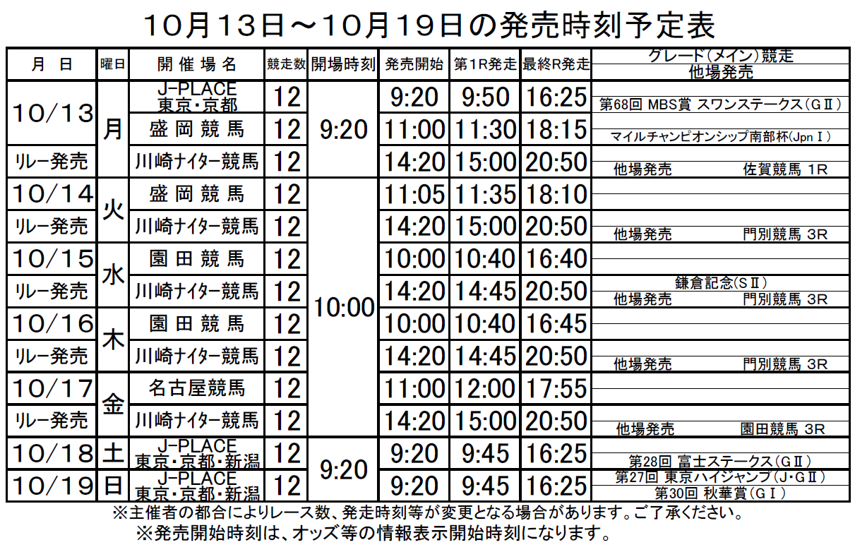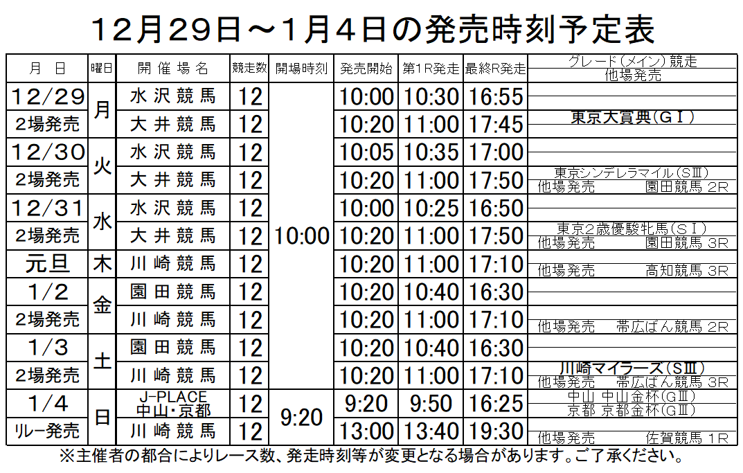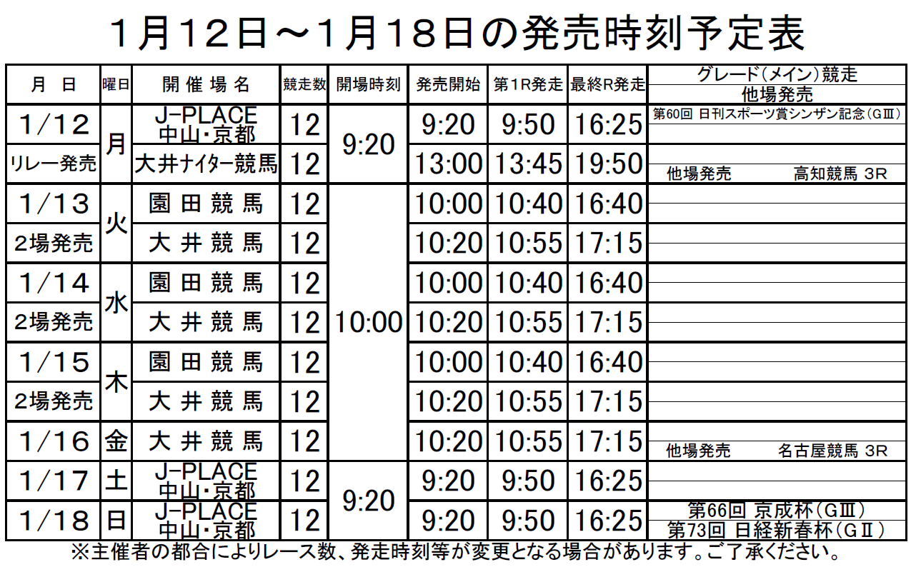 ニュートラック福島スケジュール JRA・ダートグレード・南関東重賞競走(予定) 開催は現地の天候により、変更になる場合があります。 発売日程は予定につき日程及び競走タイトル名が変更される場合があります。 発売日程の変更は当サイトでお知らせいたします。 無理のない資金で余裕をもってお楽しみ下さい。 競馬をお楽しみいただくために(のめり込みに不安のある方へ)
